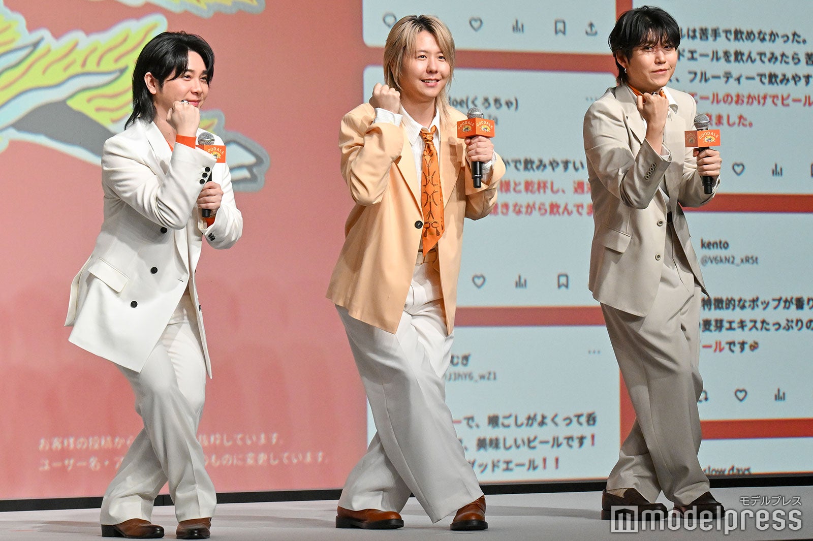 3人組バンド・Mrs. GREEN APPLE(大森元貴、若井滉斗、藤澤涼架)、女優の綾瀬はるか、浜辺美波、俳優の鈴木亮平が3日、「『キリングッドエール』5000万本突破!“大反響”御礼発表会」に出席。舞台袖で怒られた理由を明かした。