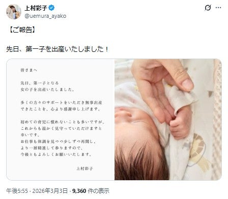 上村は「先日、第一子となる女の子を出産いたしました」と報告。第1子の顔と小さな手を握る写真を添えながら「多くの方々のサポートをいただき無事出産できたことを、心より感謝申し上げます」と周囲への感謝をつづった。「初めての育児に慣れないことも多いですが、これからも温かく見守っていただけますと幸いです。お仕事も体調を見つつ少しずつ再開し、より一層精進して参りますので、今後ともよろしくお願いいたします」と今後についても意気込んでいる。