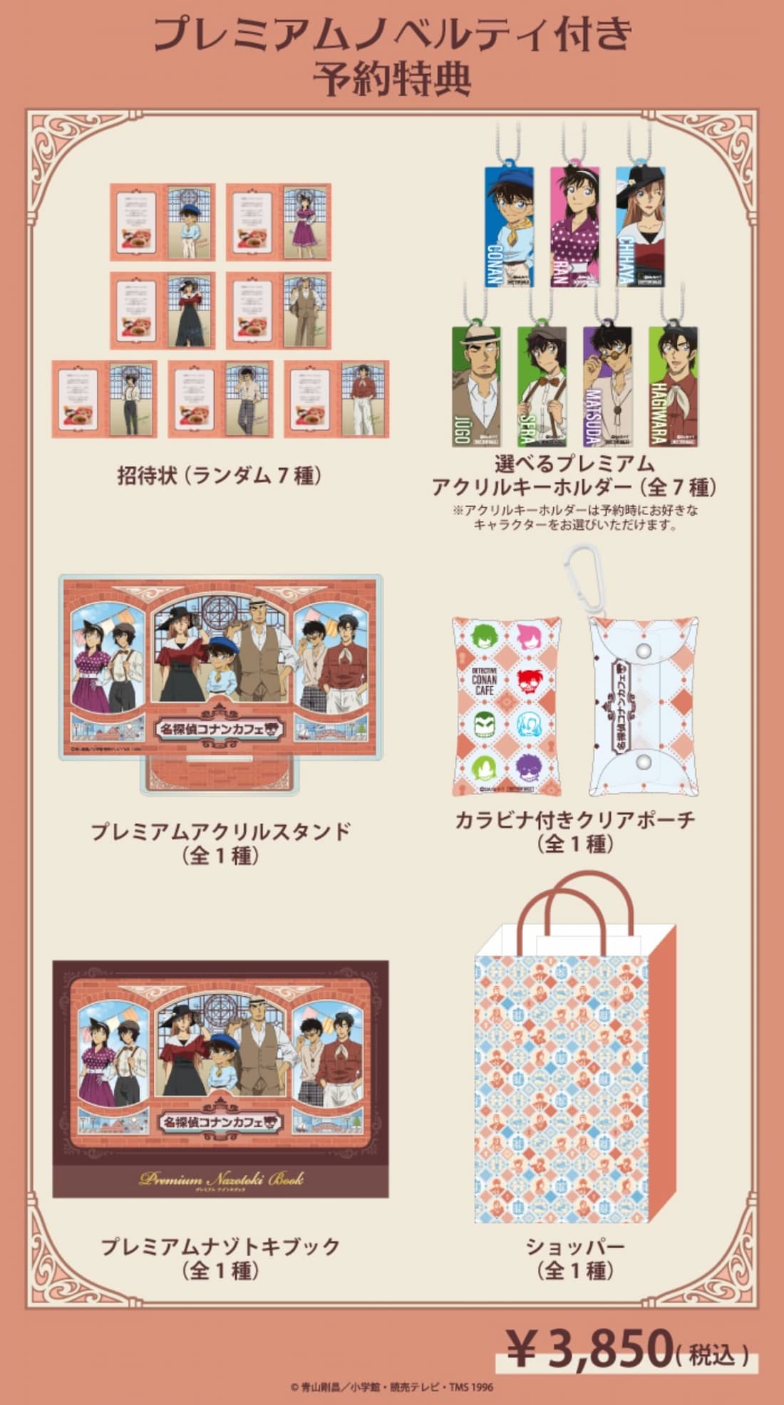 「通常予約」を利用してメニューを注文した人には「招待状(ランダム7種)」が、「プレミアムノベルティ付き予約」を利用してメニューを注文した人には「招待状(ランダム7種)」「選べるプレミアムアクリルキーホルダー(全7種)」「プレミアムアクリルスタンド(全1種)」「カラビナ付きクリアポーチ(全1種)」「プレミアムナゾトキブック(全1種)」「ショッパー(全1種)」がプレゼントされるので、予約して来店するのがおすすめです♡