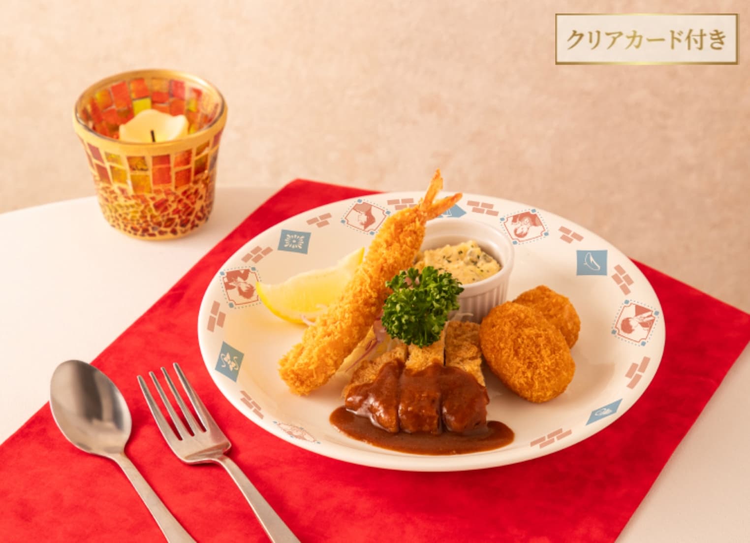 フードには、粉チーズで白い羽が舞うような華やかさを表現した「白い羽舞うナポリタン~風の女神~」と、堕ちゆく堕天使のように欧風カレーをかけて食べる「堕ちゆくライスカレー~黒き堕天使~」が登場します。プレートのデザインは7種のキャラクターから選べ、特典として選んだキャラクターのクリアカード付きです。