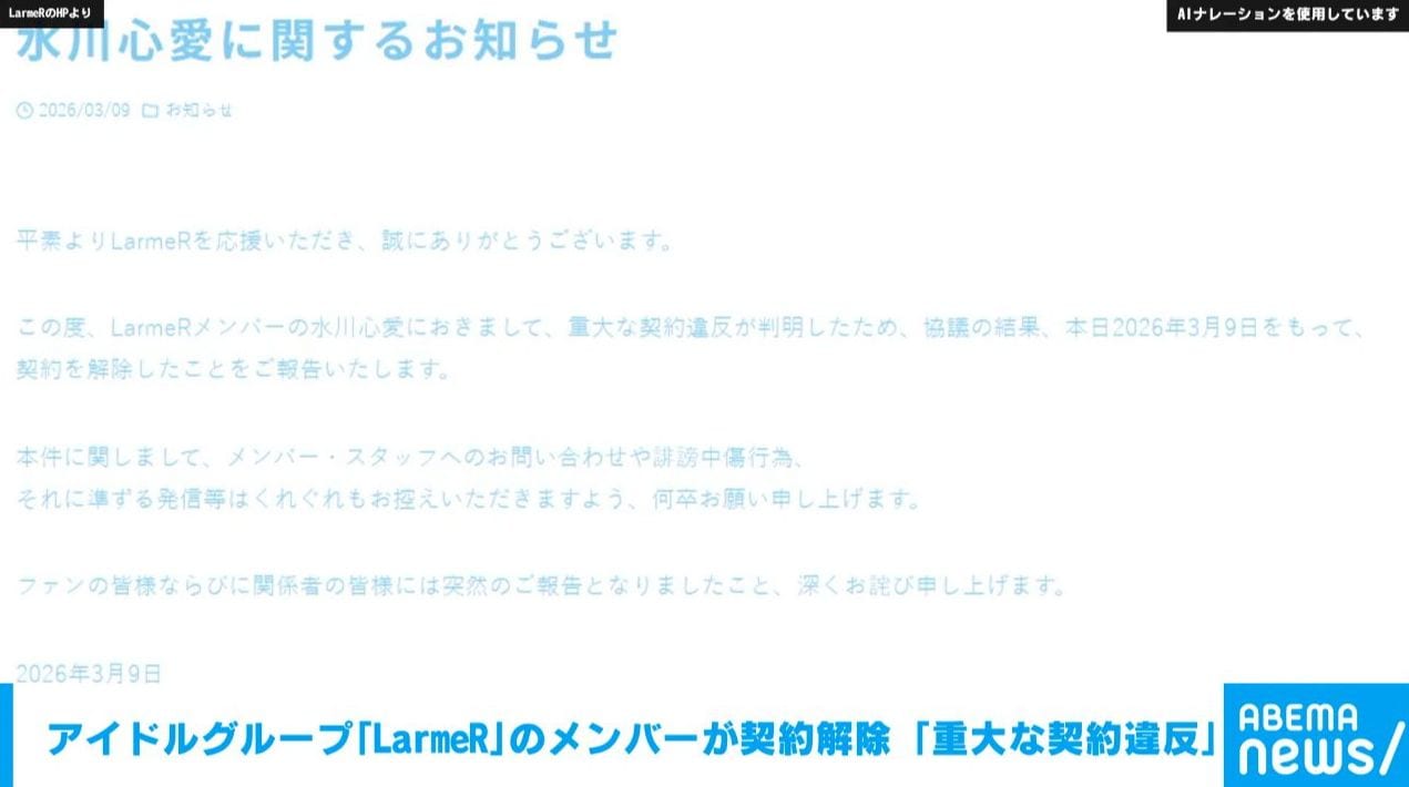 平素よりLarmeRを応援いただき、誠にありがとうございます。この度、LarmeRメンバーの水川心愛におきまして、重大な契約違反が判明したため、協議の結果、本日2026年3月9日をもって、契約を解除したことをご報告いたします。