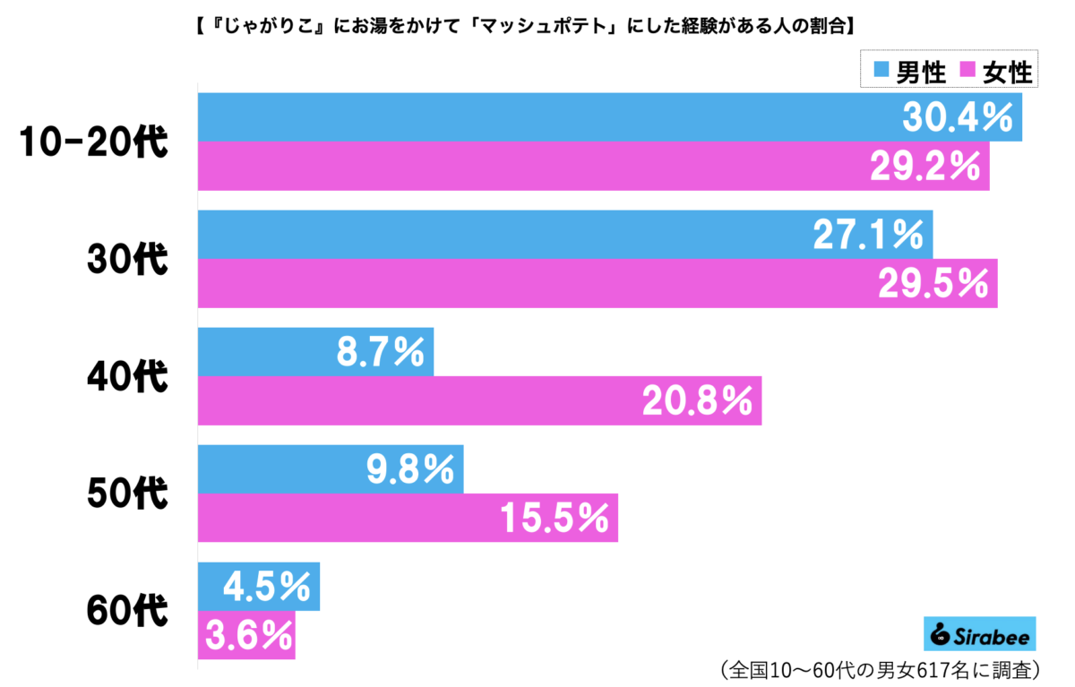 以前、Sirabee編集部が全国の10~60代の男女617名を対象にアンケート調査を行ったところ、『じゃがりこ』にお湯をかけるとマッシュポテトになることを知っていたのは、全体の60.1%と判明。