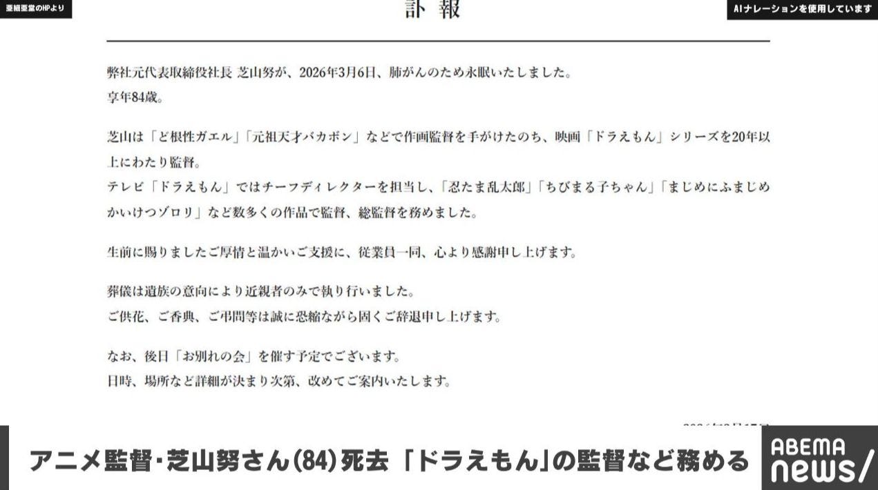 ドラえもんを始め、多くの作品を手掛けたアニメ監督の芝山努さんが亡くなりました。84歳でした。