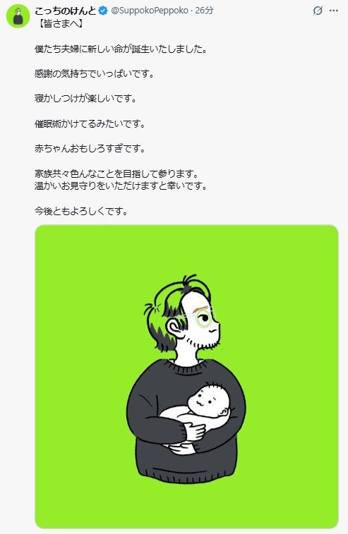 こっちのけんとは【皆さまへ】とし、「僕たち夫婦に新しい命が誕生いたしました。感謝の気持ちでいっぱいです」と報告。「寝かしつけが楽しいです。催眠術かけてるみたいです。赤ちゃんおもしろすぎです」と誕生後の日々をつづった。続けて「家族共々色んなことを目指して参ります。温かいお見守りをいただけますと幸いです」と記し、「今後ともよろしくです」と結んだ。投稿では、自身が子どもを抱えるイラストも公開している。(modelpress編集部)