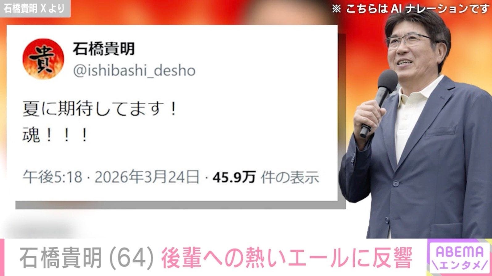 お笑いコンビ「とんねるず」の石橋貴明(64)が、後輩への熱いエールを投稿し、話題になっている。