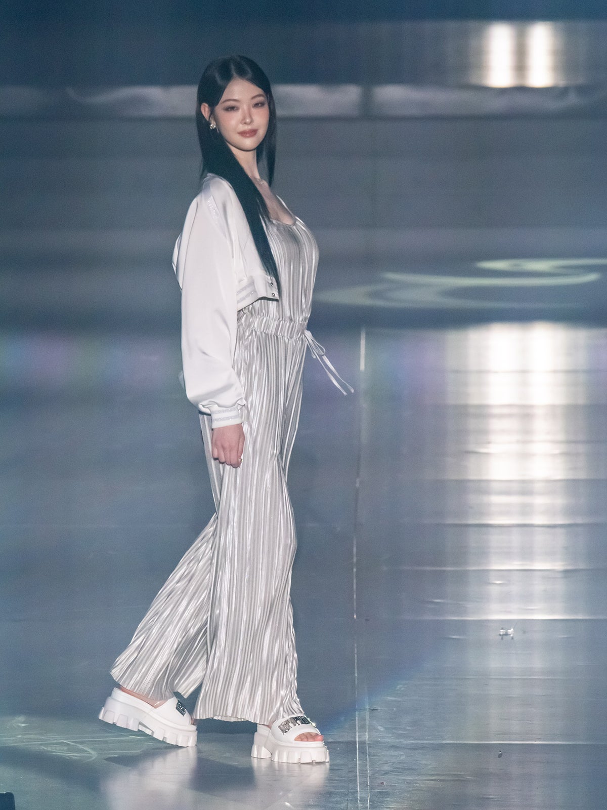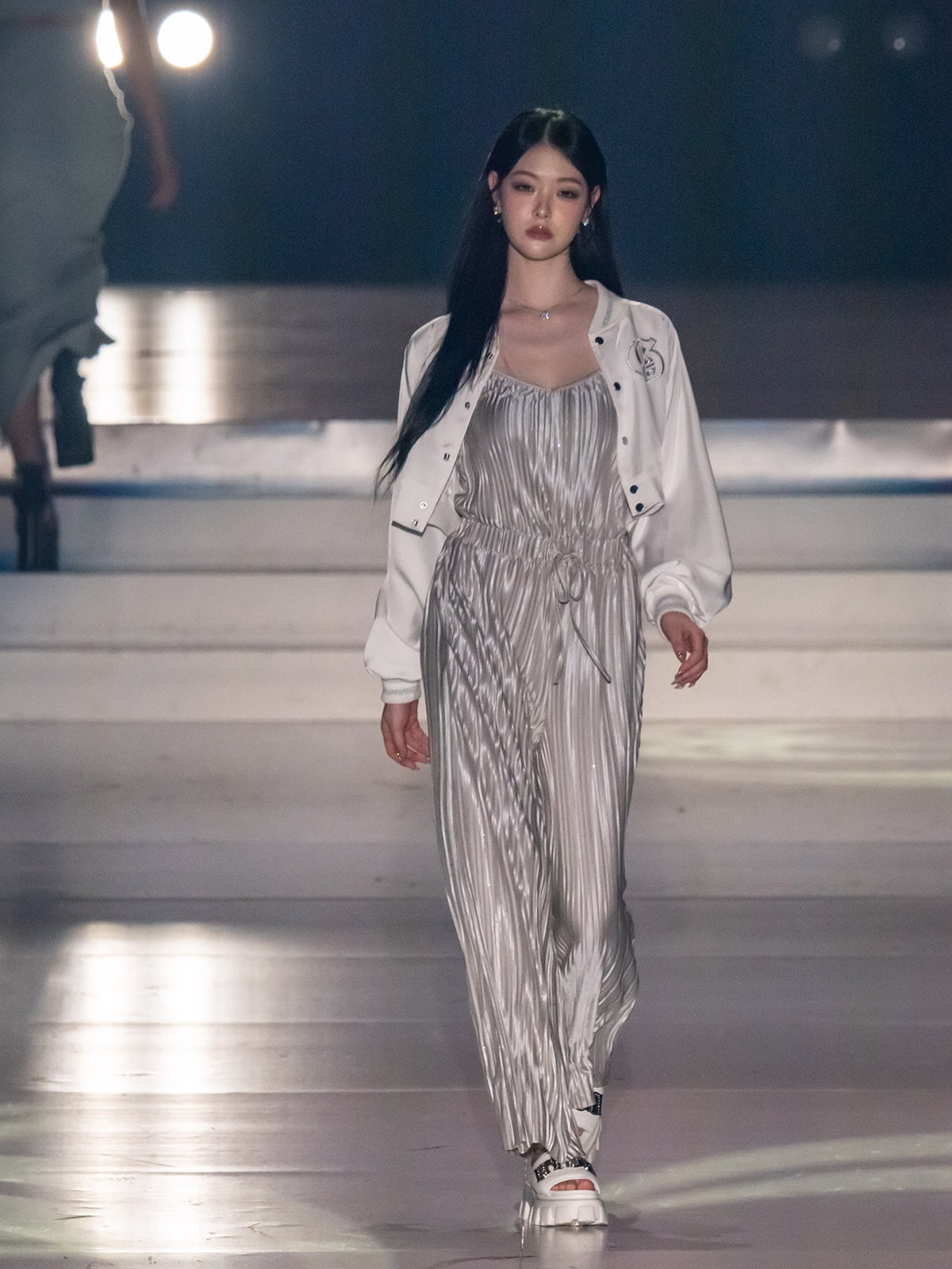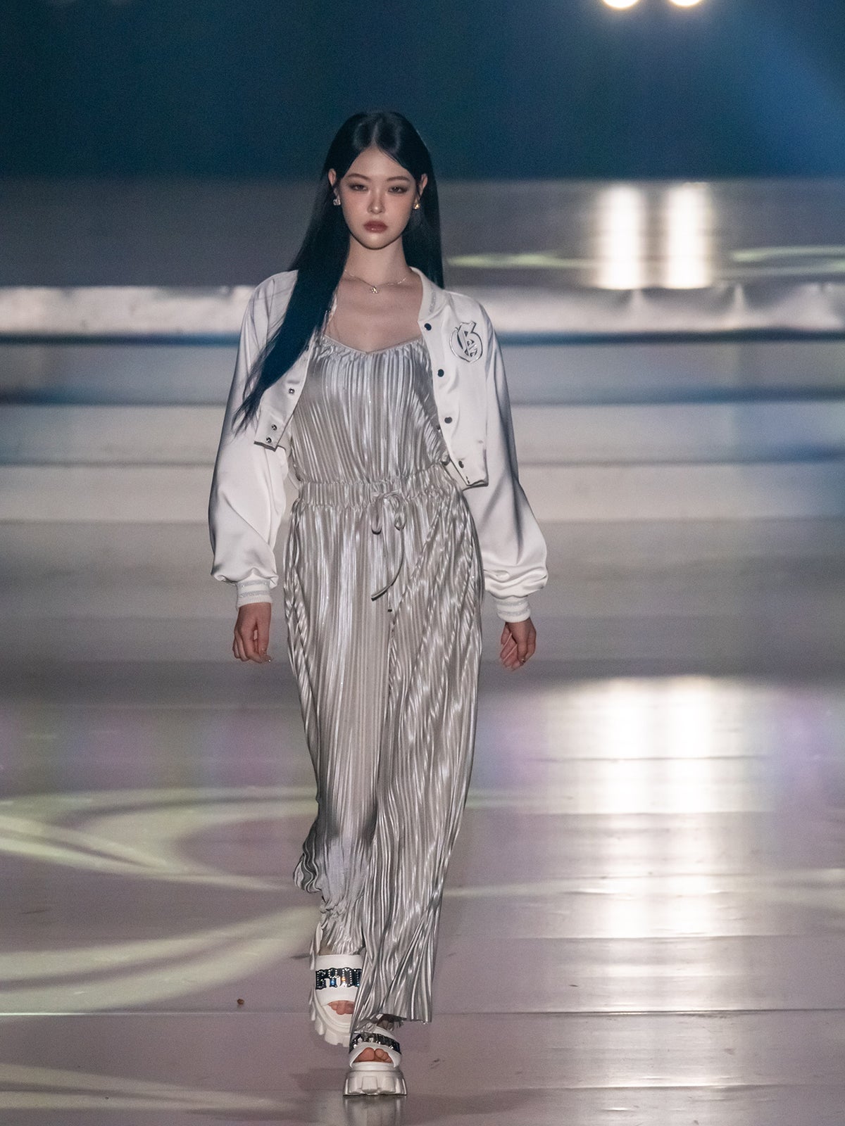 リンは、サロペットパンツにジャケットを合わせた春らしい装いで登場。足元には高めのサンダルを合わせることでさらに強調された縦のラインは、スタイルをより一層際立たせた。終始クールな表情でランウェイを歩き、脚の長さとウエスト位置の高さによる抜群のプロポーションで会場を魅了。記念すべき初ランウェイながら、堂々と歩く姿は新人とは思えないほどの完成度だった。