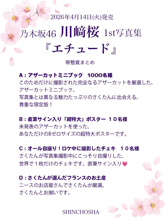 帯懸賞特典の1つは、応募者の中から抽選で当選する「アザーカットミニブック」。写真集を手掛けたスタッフが集結し、全ページ撮り下ろすという気合の入った1冊となっている。写真集『エチュード』とはまた違ったコンセプトの川﨑を見ることができ、抽選で1000人にプレゼントされる。アザーカットミニブックのコンセプトは、「もし“あの日”川﨑桜が乃木坂46のオーディションを受けていなかったら」。乃木坂46・5期生オーディションでは、応募者の殺到により公式サイトのサーバーがダウンし、締め切りが1日延長された。このニュースをきっかけに応募した川崎だが、もしその“延長の1日”がなかった場合、どのような人生を歩んでいたのか。そんな“もう1つの可能性”をテーマに撮り下ろされている。