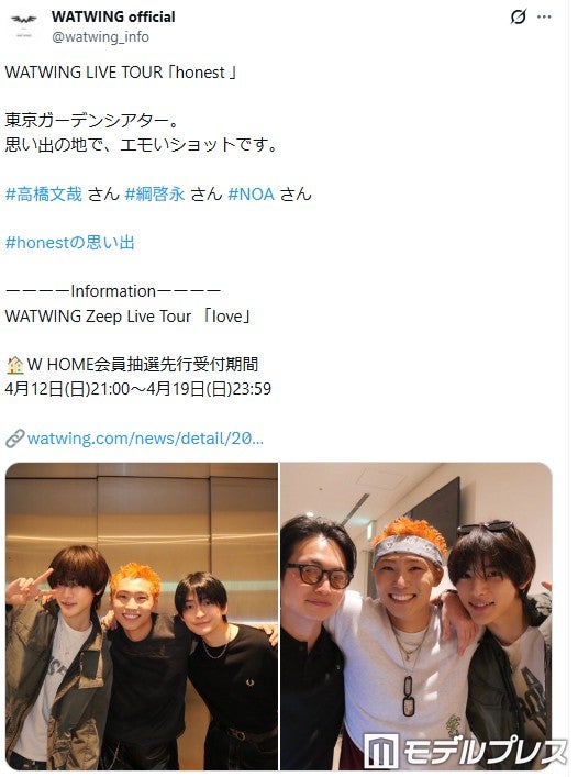 WATWINGは4月12日、2025年9月6日の鹿児島公演を皮切りに全国を巡ったツアーのファイナル公演「WATWING LIVE TOUR 2025 – 2026『honest』〜Special Edition〜The Final」を東京・東京ガーデンシアターにて開催。公式SNSでは「東京ガーデンシアター。思い出の地で、エモいショットです」とつづり、会場に駆けつけたNOA、高橋、綱と八村が並んだ写真を公開。投稿された写真には八村、NOA、高橋が仲良く肩を組んだ3ショットや、八村と綱とNOAが肩を寄せ合いピースサインを作った3ショットが収められている。東京ガーデンシアターは2022年12月2日~4日に8LOOMがラストライブ「君の花になる“Let’s 8LOOM” TOUR ~THE FINAL~」を行った会場。八村は同会場での単独公演という節目で8LOOMメンバーとの再会を果たした。