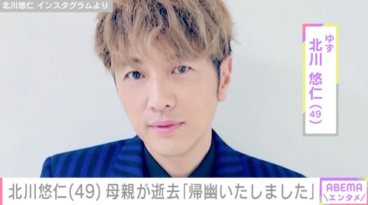 2026年4月15日に更新された、ゆずの公式サイトでは「ゆず・北川悠仁に関するお知らせ 北川悠仁の母が、2026年4月7日に永眠いたしました」と、北川の母親が88歳で亡くなったことを報告。
