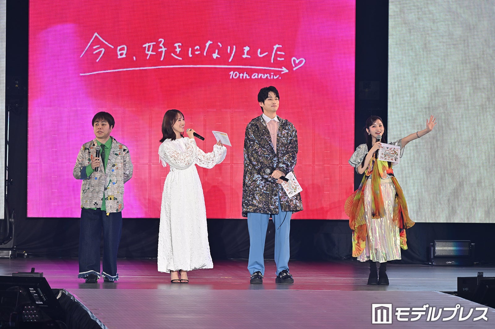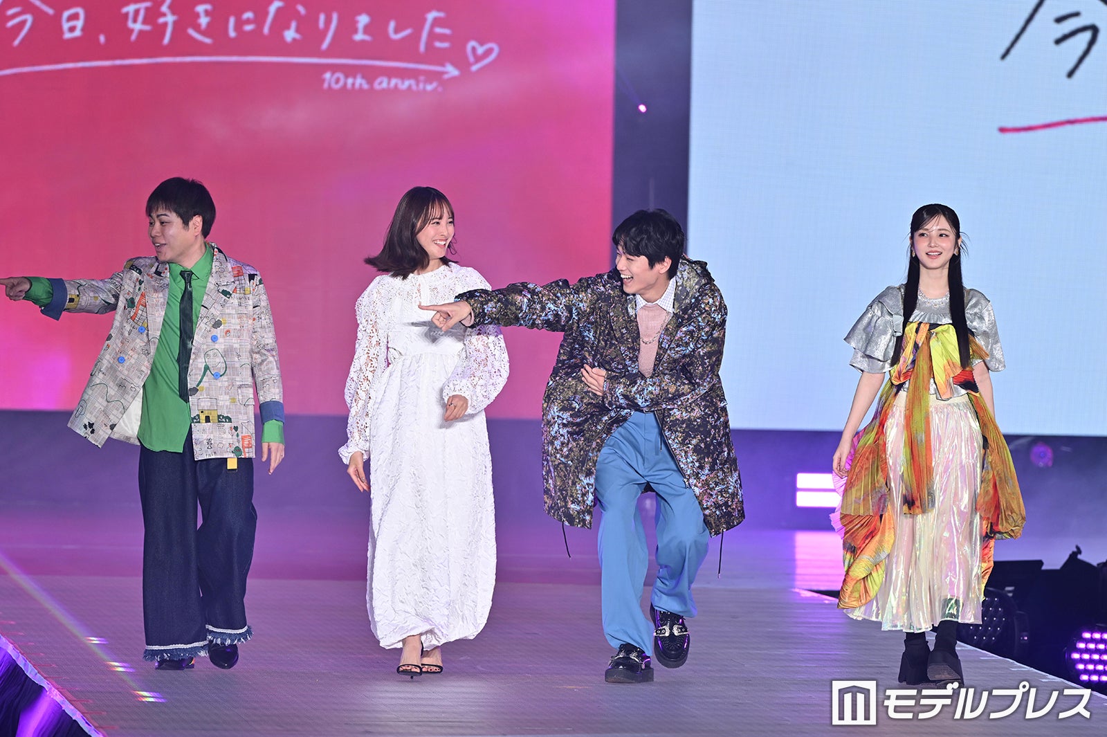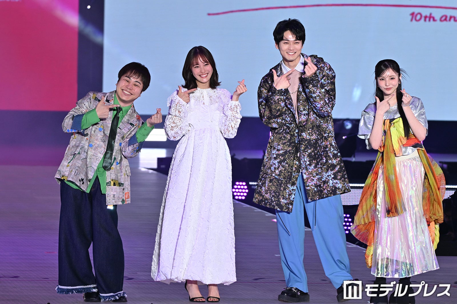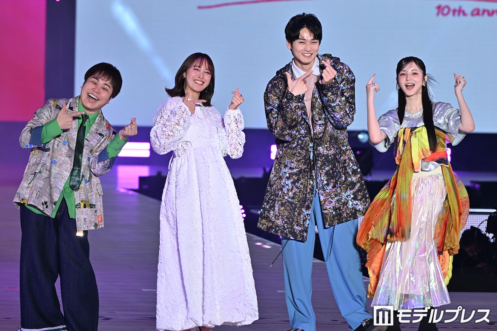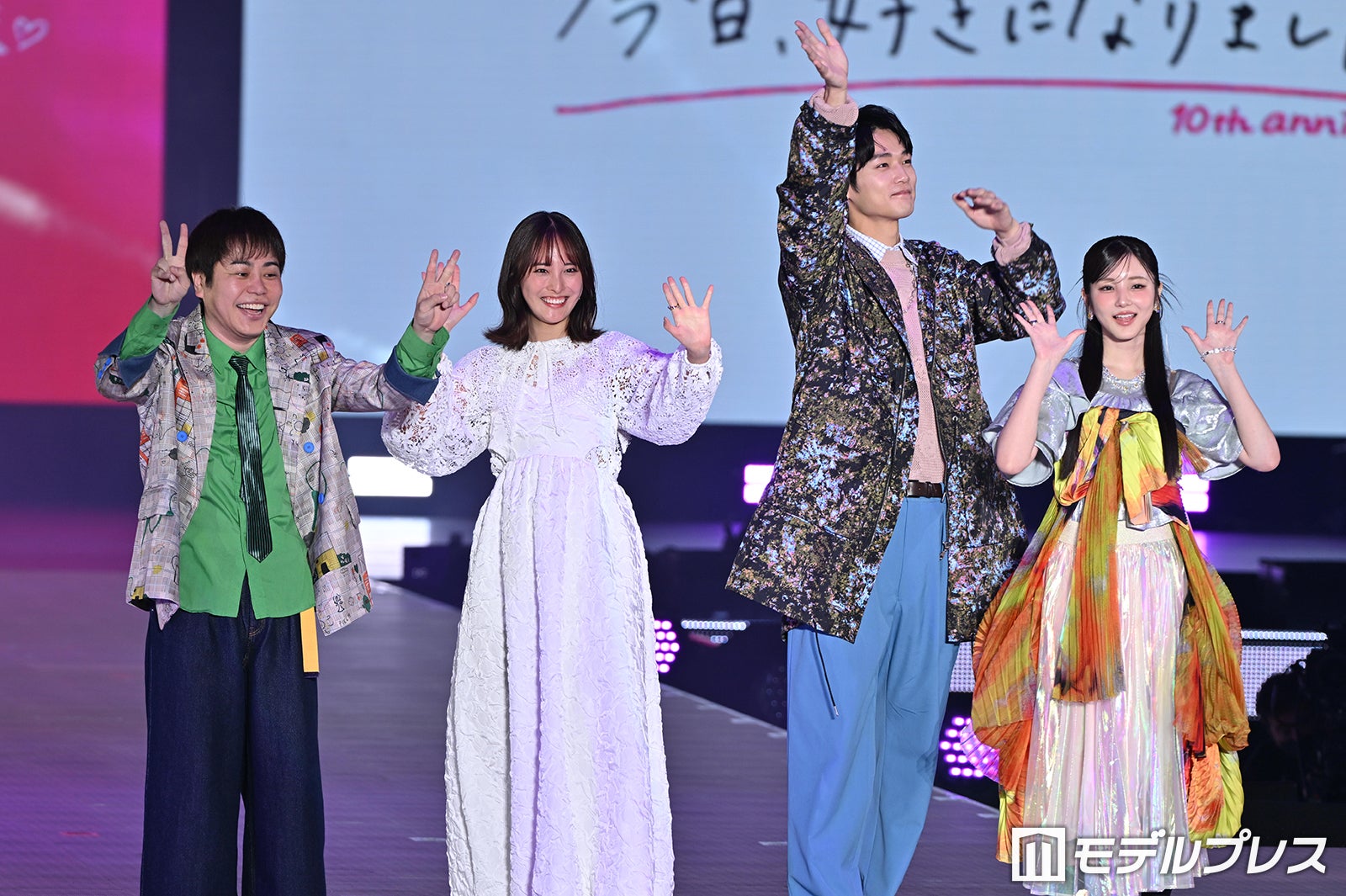 現役高校生たちのリアルで等身大な本気の恋と青春を届ける「今日好き」のスペシャルステージに、歴代出演者の岩間夕陽、瀬川陽菜乃、葛西杏也菜、紗和、小林ゆあ、白石乙華、長浜広奈に加え、歴代の成立カップルも登場「卒業編2026」から今井暖大と時田音々の“はるねね”カップル、「チェンマイ編」から倉澤俊と谷村優真の“しゅんゆま”カップル、「夏休み編2025」から内田金吾と多田梨音の“きんりの”カップルが揃ってランウェイを歩き、普段の制服姿とは異なるモードな雰囲気たっぷりで、印象をガラリとチェンジした。さらに、恋愛見届け人として出演するNON STYLEの井上裕介、かす、中川大輔、大友花恋も登場し、会場からは歓声が。「いつもと雰囲気違う!」「カッコいい」「別人みたい」などの声が上がっていた。