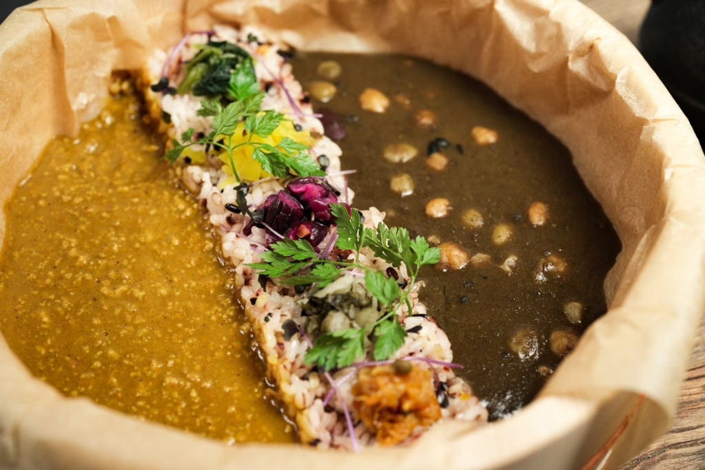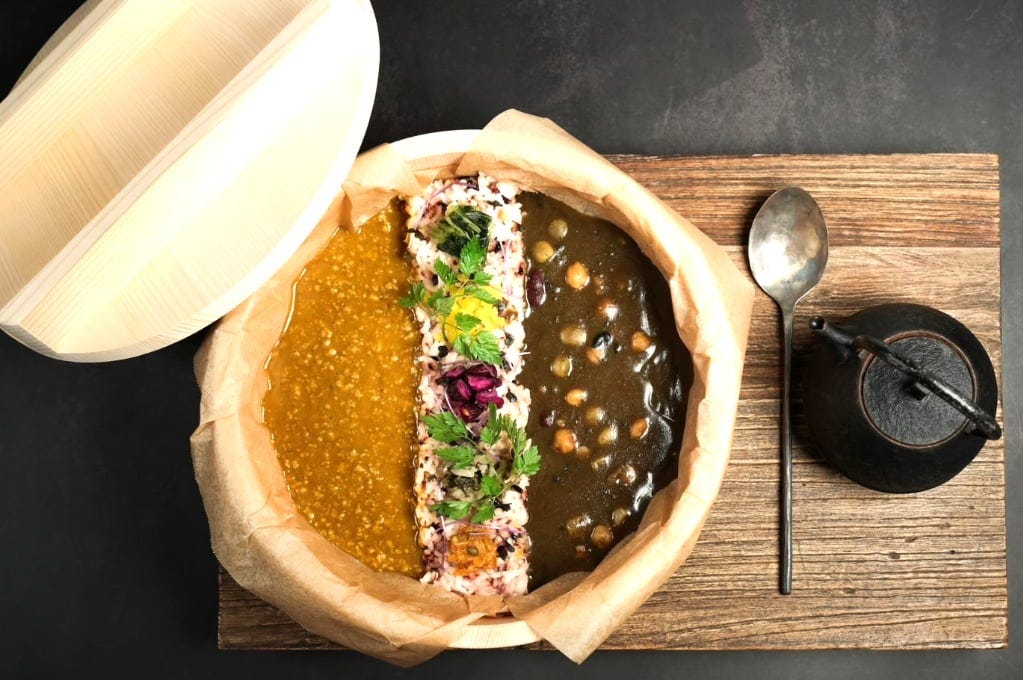 寿司桶で提供される見た目も新感覚なスパイスカレー 植物性食材のみで旨みを出したビーガン仕様 京風だしを加えれば軽やかなスープカレーに!寿司桶で提供される見た目も新感覚なスパイスカレー