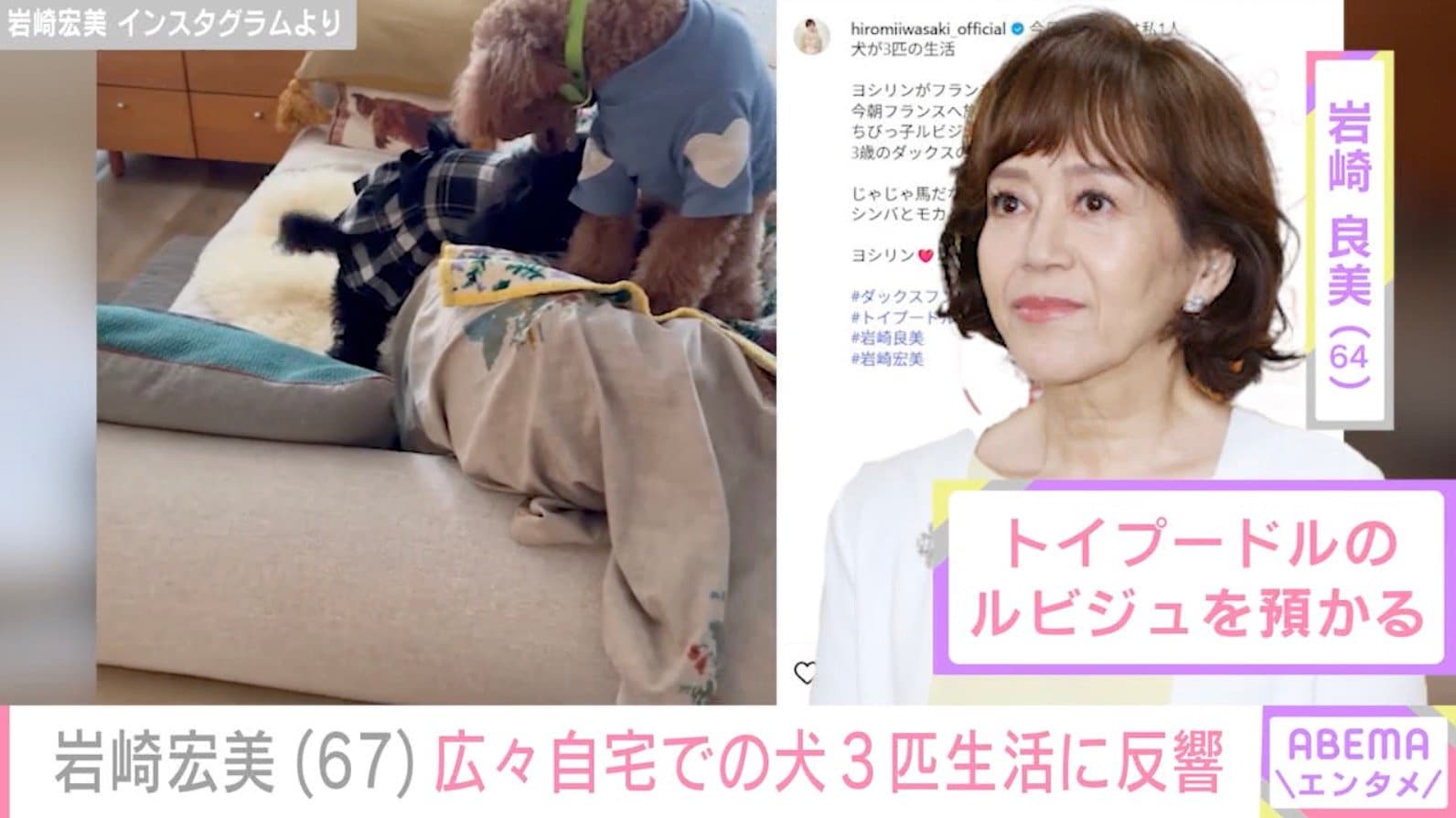 4月27日の投稿では、「きょうから人間は私1人。犬が3匹の生活。ヨシリンがフランス旅行のため今朝フランスへ旅立ったので、ちびっ子ルビジュ預かりました。じゃじゃ馬だなぁ〜。シンバとモカと私、頑張りまーす」とつづり、妹で歌手の岩崎良美(64)の愛犬、トイプードルのルビジュが加わった“3匹生活”が始まったことを報告。ルビジュが広々としたベッドルームやリビングではしゃぐ姿を公開し、愛犬とともに過ごす様子を披露した。