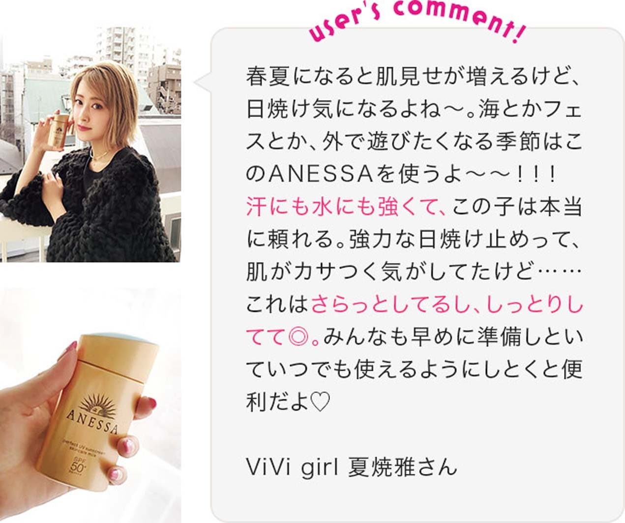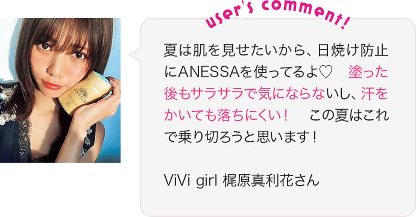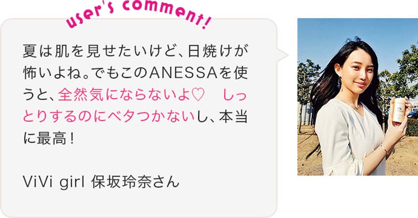 アネッサを使っている、読者モデルの夏焼雅さん、保坂玲奈さん、梶原真利花さんもラブコールを送っています。美肌に導くパワフルUV