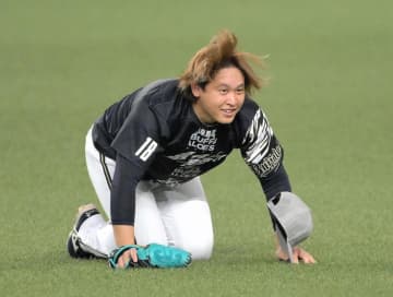 「オリックス-西武」(1日、京セラドーム大阪) オリックスの宮城大弥投手が試合前練習中、両手を突き、...