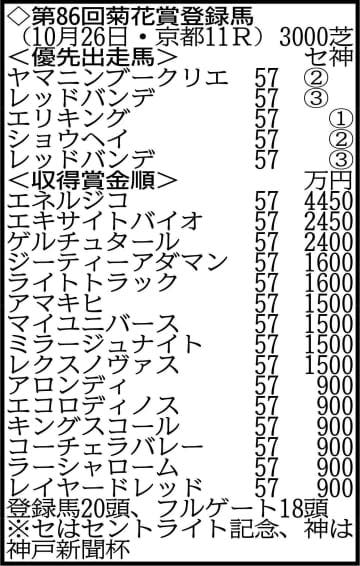 「菊花賞・G1」(26日、京都) JRAは13日、クラシック3冠最終戦の登録馬を発表した。 皐月賞馬...