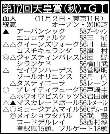 「天皇賞(秋)・G1」(11月2日、東京) 今年は実績のある古馬勢と、クラシックで結果を残してきた3...