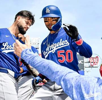 「ナショナルズ6-13ドジャース」(3日、ワシントン) ドジャースのムーキー・ベッツ内野手が同点の三...