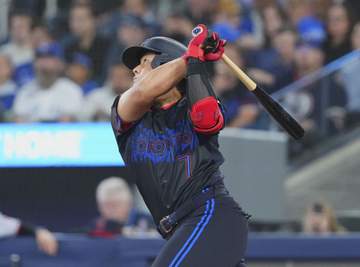 「ブルージェイズ6-8ガーディアンズ」(24日、トロント) ブルージェイズの岡本和真内野手が7番・三...
