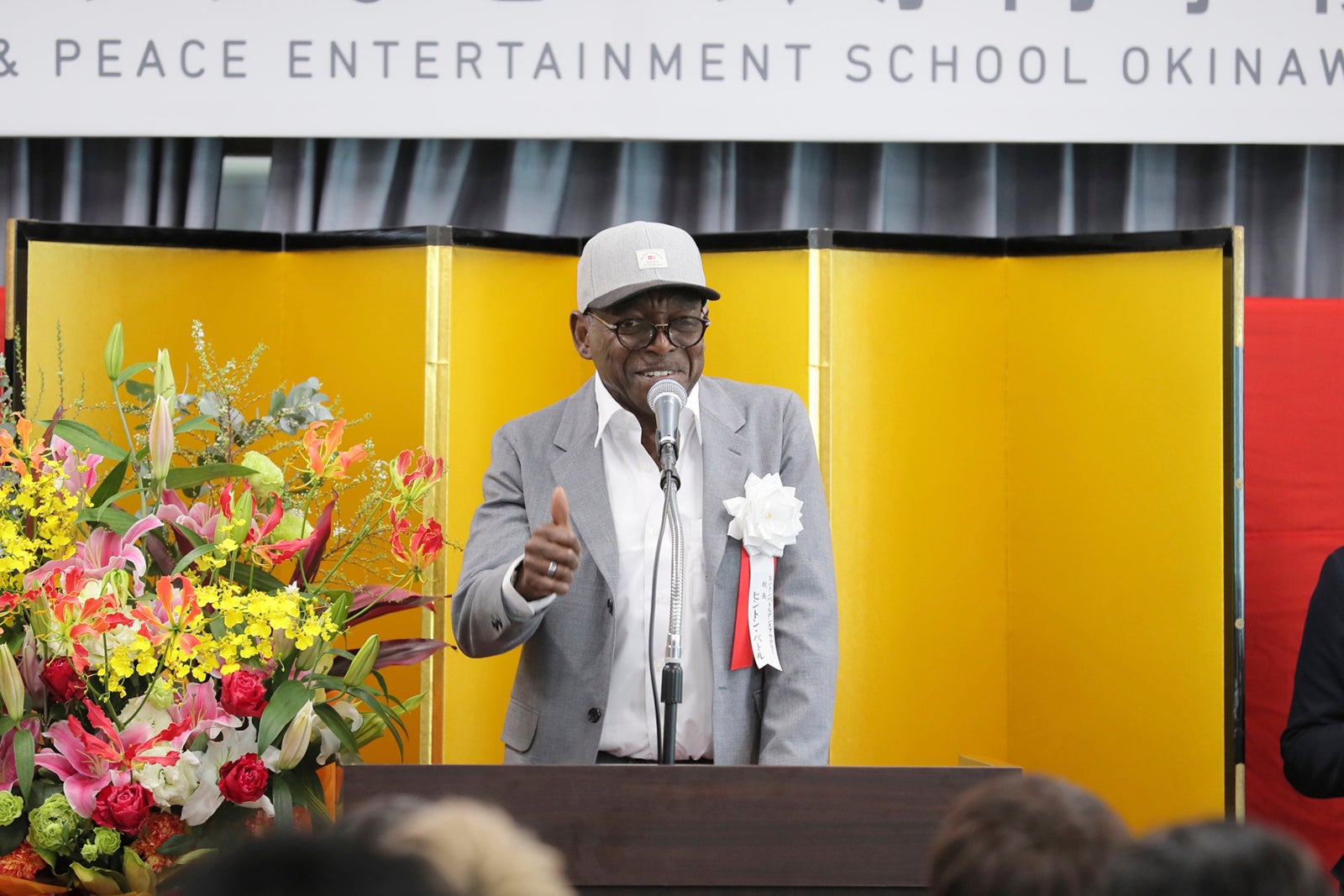 落成式に続き、司会を務めるガレッジセールと宮川により開会の辞が述べられ入学式へ。栄えある第1期生となる36名の新入生が入場した。そして開校宣言、来賓による祝辞後、クリエイティブ学科 マンガコース講師・堀江信彦氏は「あと20年もすればAIに人間が取って代わられると言われています。その中で人間は『人間に生まれてよかった』と思えることをやるべきだし、あなたたちが学ぼうとすることはそういうことだと思います」と生徒たちに期待を寄せる。さらに、堀江氏の「1期生にはだいたい天才が現れます」という言葉に、ゴリは「確かに、NSCの1期生はダウンタウンですもんね」と納得した表情で頷いていた。パフォーミングアーツ学科 パフォーマーコースのダンス講師・ヒントン・バトル氏は、「コンニチハ!」と大きな声で挨拶したあと「本コースの講師陣は充実していますので、みなさんはこの学校での学びを最大のものにしてください」とメッセージ。「イエーイ!」と笑顔でテンション高く挨拶をし、新入生を和ませていました。