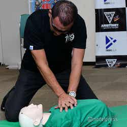 今までも、防災や救命についての普及活動を行ってきた蝶野。今回は、自身の呼びかけに応えて集まったレフェリーたちと共に講習を受けたあと、AED(自動体外式除細動器)などを使った訓練に参加した。訓練用の人形に呼びかける際には「方正!」と、『ダウンタウンのガキの使いやあらへんで!』の年末スペシャルで共演している月亭方正の名前を出し、会場を沸かせた。