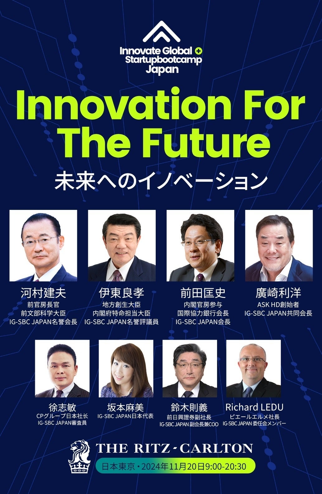 Innovate Global(IG)は、 Startupbootcamp(SBC)と提携し、世界80カ国以上をカバーする世界最⼤級のイノベーションエコシステムを構築しました。最先端医療、気候変動·環境対策、Web3、AI、デジタル経済など、幅広い業界にわたる革新技術をテーマに掲げています。日本で開催するにあたり、日本を代表する起業家や投資家、そしてグローバルなビジネスリーダーたちが⼀堂に会し、世界を変えるビジネスとテクノロジーが生まれる瞬間に⽴ち会い、新たなビジネスチャンスを得る絶好の機会となることでしょう。IG-SBCはアジアへさらに拡⼤し、日本で初のイベントを開催します。IG-SBC Japanは、2024年11月20日に東京のリッツ・カールトンで⾏われます。日本は最先端技術のリーダーであり、成⻑しつづけている起業家コミュニティで溢れています。IG-SBC Japanは、未来の世界をサポートする革新的なビジネスに光を当てることを目指しています。IG-SBC Japanは、業界リーダーとスタートアップが集まるプラットフォームを提供します。