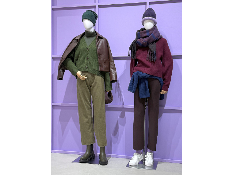 ユニクロは25年秋冬、セーターを拡販する。前季から据え置きの税込み9990円で販売するカシミヤセーター(クルーネック)のほか、トレンドのショート丈も加わったメリノウール、独自開発でチクチクしにくい「スフレヤーン」、スウェットシャツ感覚で着られる「ウォッシャブルミラノリブ」の4タイプで計40型、100色のバリエーションを訴求し、客層拡大を図る。