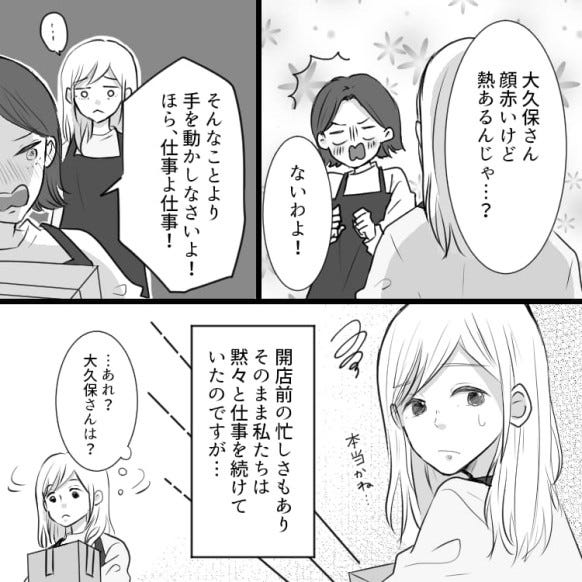ある日、大久保さんとシフトが被ったときに、彼女が体調不良で倒れてしまい……。