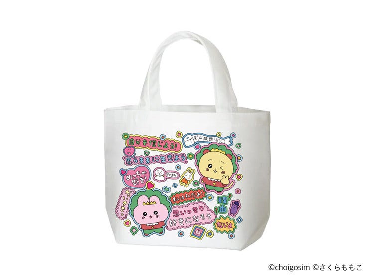 「コジコジ」と「うさゴシム」の刺繍をあしらったトートバッグやポーチ、「私は私だよ!」「思うままに生きよう」など、