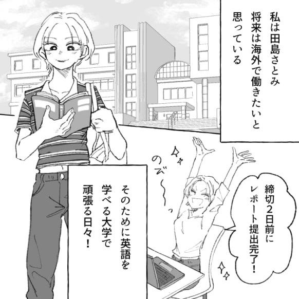 主人公は、将来海外で働きたいという夢があります。そのため、在学中に留学をするべく日々勉強を頑張っていました。
