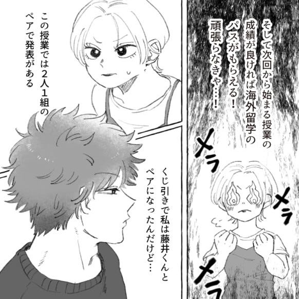 やる気がない男子とペアを組むことになった主人公は、ひとりで頑張ってなんとかスピーチの試験を乗り切ろうとします。