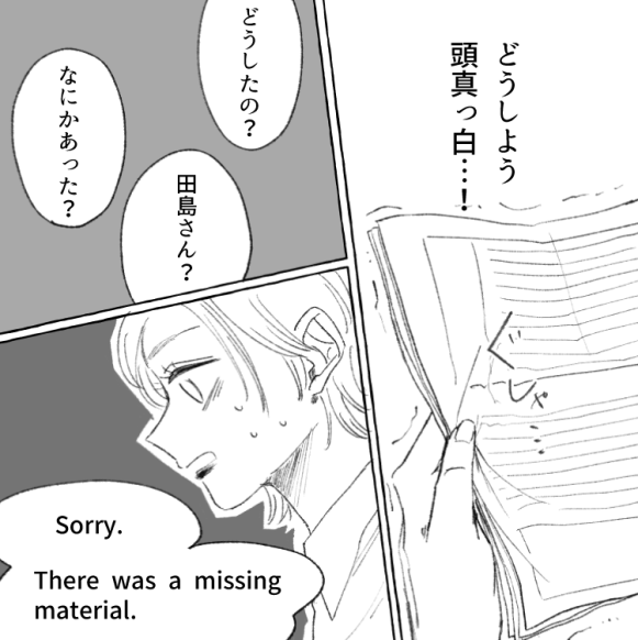 資料が抜けていることに動揺し、頭が真っ白になった主人公。この状況をどうやって乗り切るのでしょうか…?