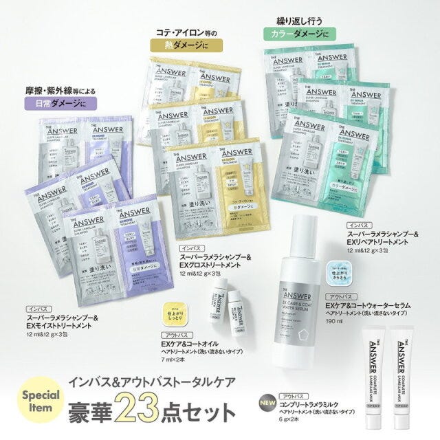 2024年に誕生し、美容のプロの間でも話題の「THE ANSWER(ジアンサー)」から、ブランドのすべてのアイテムが試せる豪華7種23点セットが登場!花王100年のヘアケア研究から生まれた「THE ANSWER(ジアンサー)」は、うるおい、まとまり、ツヤめき、なめらかで、しなやかな美しい髪へ導いてくれるヘアケアブランド。一度使ったらもう手放せなくなっちゃうかも!