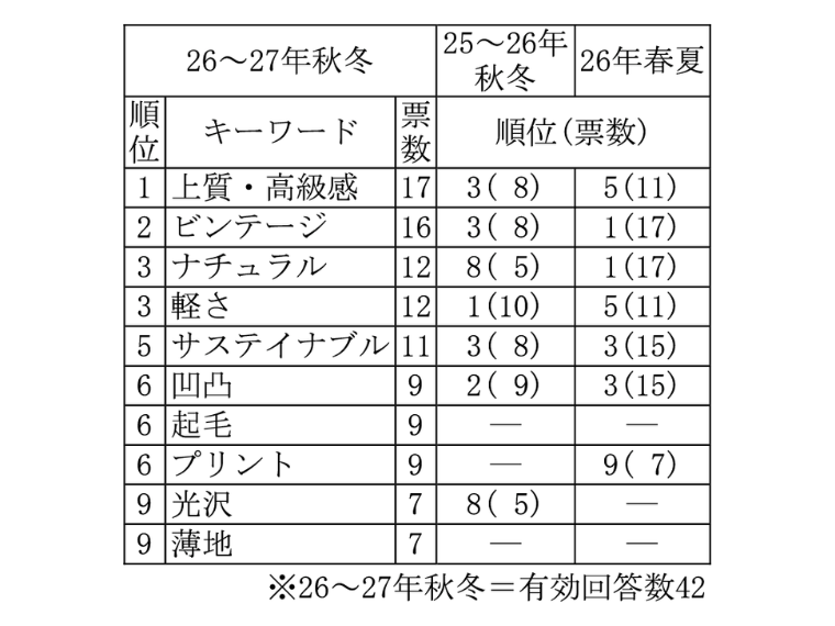 繊研新聞社が調査した26~27年秋冬テキスタイルキーワードランキングは「上質・高級感」が前シーズンの3位から順位を上げ、トップになった。小差で「ビンテージ」、「ナチュラル」と続き、カジュアルトレンドが継続している。