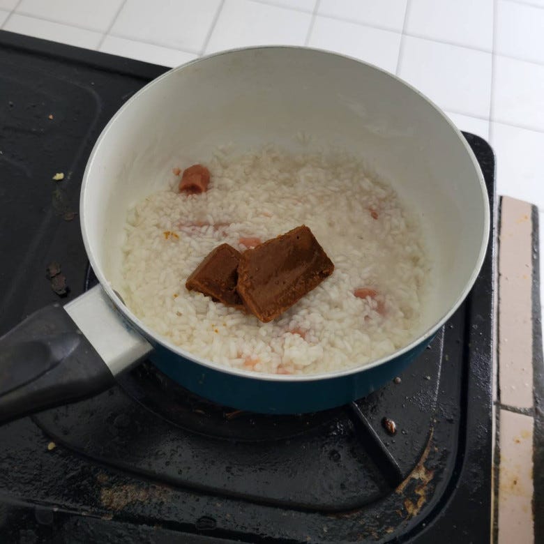 1、コメをフライパンに入れ、指の第一関節くらいまで水を入れます。沸騰したら5分蓋をし、火を止め、10分蒸す。←蒸すのが大事!