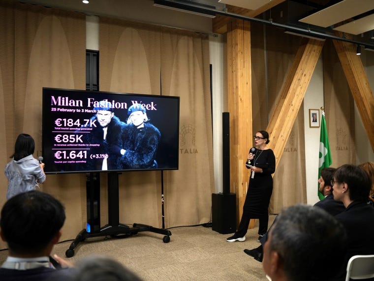 同州におけるファッション業界の売り上げは約4兆1600億円で、ファッション企業は約2万8000社あり、18万人ほどが業界で働いているという。バルバラ・マッツァーリ氏は、「州にとって、ファッション業界はとても重要」と強調。「ロンバルディア州の物作りの良さを世界に伝えてくれた」人物として、先日死去したジョルジオ・アルマーニ氏の功績をまとめたビデオも放映された。