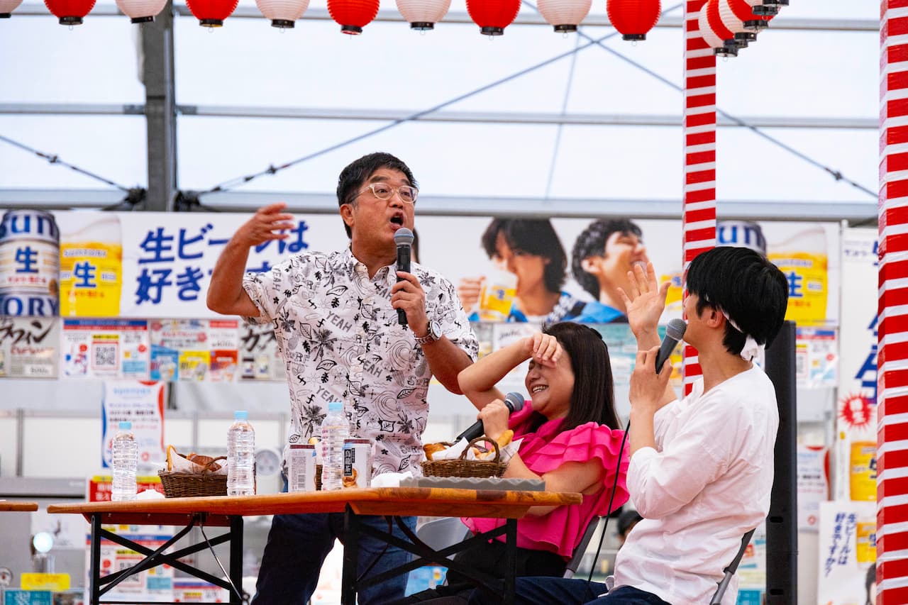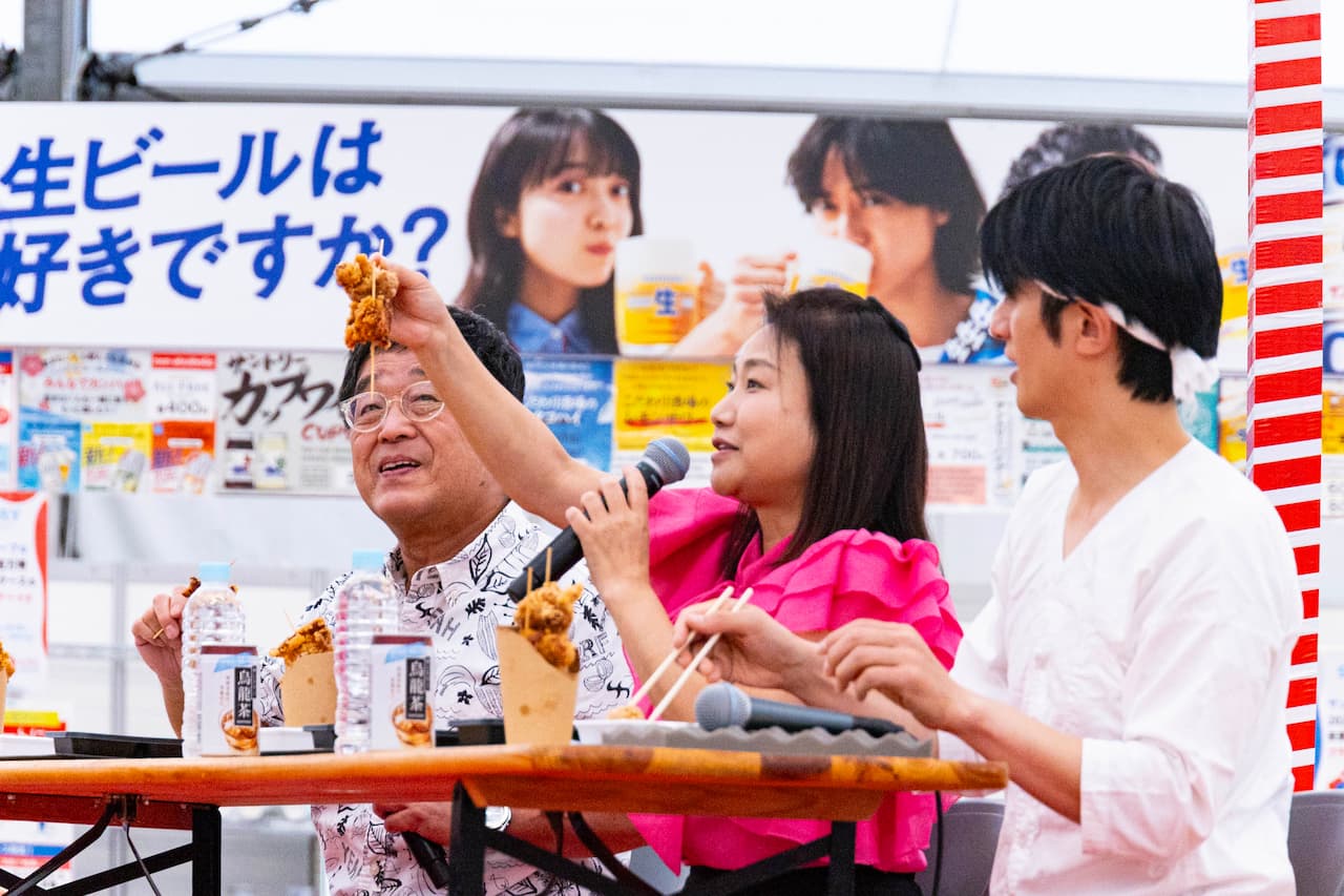キャンペーン初日の会場内「MATSURI」には、トミーズ健さん、島田珠代さん、ブラックマヨネーズ・小杉竜一さん、ツートライブ・たかのりさん、そしてNMB48の小嶋花梨さんが登壇。MCのコウノ・オブ・ザ・イヤーさんの進行で、芸人考案の唐揚げソースを試食しました。