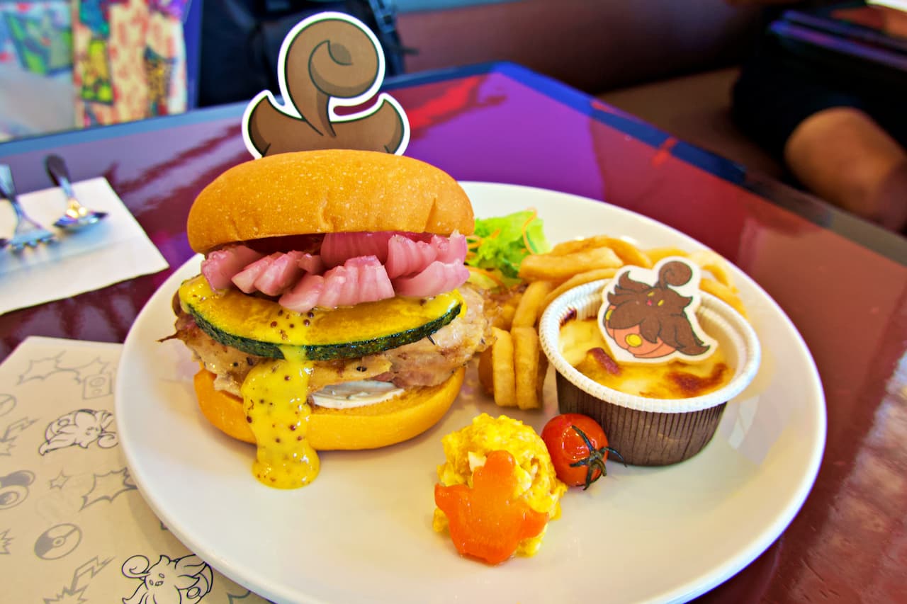 オレンジ色のランタンポケモン・バケッチャが主役の「バケッチャのまんまるチキンベーグルサンドプレート」は、ジューシーなハーブチキンとレッドオニオンをカボチャ色のベーグルでサンド。マスタードがアクセントになった秋らしい味わいです。