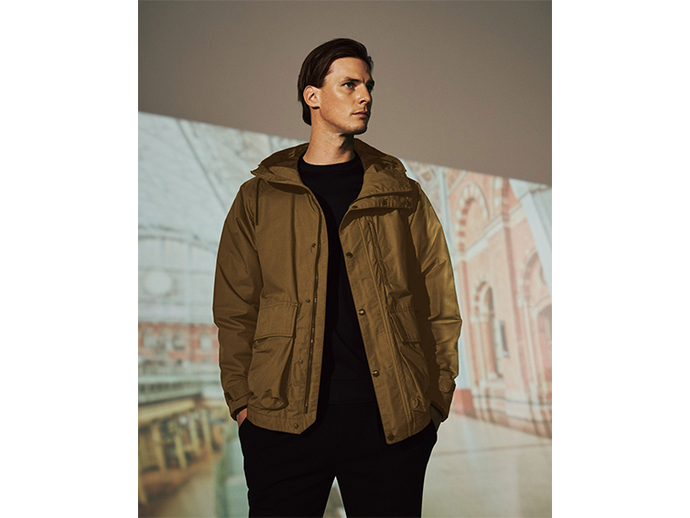 マウンテンパーカはハンドウォーマーポケットをはじめ、大小様々なポケットをバランスよく配置し、水筒や小物などもスムーズに出し入れ可能な多機能アウター。税込み10万4500円。首元のテープ仕様により別売りのインナージャケット(5万5000円)とドッキングでき、春・秋・冬の3シーズンに対応できる。