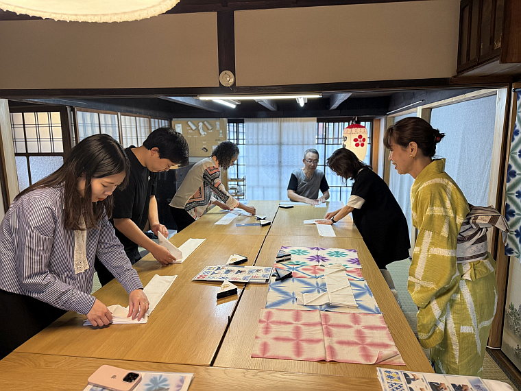 同企画は有松の伝統技術と現代の感性を結び、物作りをより身近に感じてもらうことを目的にした。国内外から計14人が参加し、職人の指導のもと絞り染めの工程を体験。模様の出方や色の重なりに一喜一憂しながら、手作業で生まれる唯一無二の表情を楽しんだ。