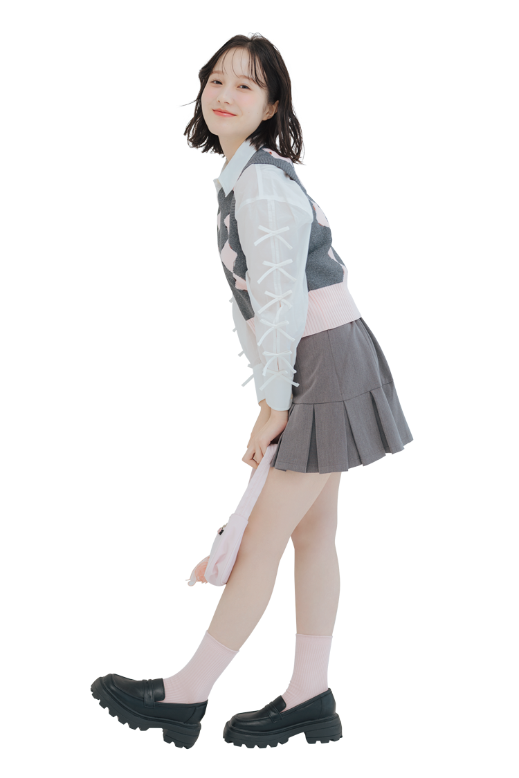シャツ、ベスト:FUR FUR ミニスカート:GRL バッグ、チャーム:emis ローファー:United Nude