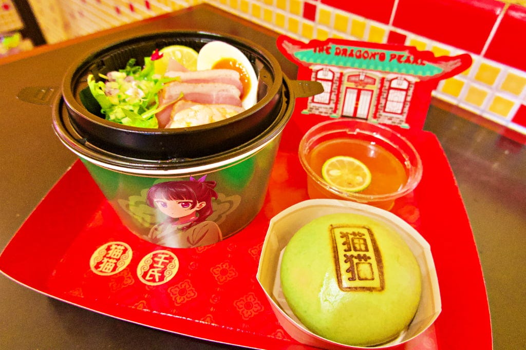 宮廷のような雰囲気が漂うレストラン「ザ・ドラゴンズ・パール」では、『薬屋のひとりごと』の世界観を再現した限定メニューが登場。おすすめは「猫猫の彩りスダチ冷麺コンボ」。翡翠のように美しい冷麺と緑の中華まんがセットになった一皿で、プリプリのエビと合鴨がトッピングされた冷麺は、あっさりとしたスープと相性抜群。スダチの香りが爽やかに広がります。