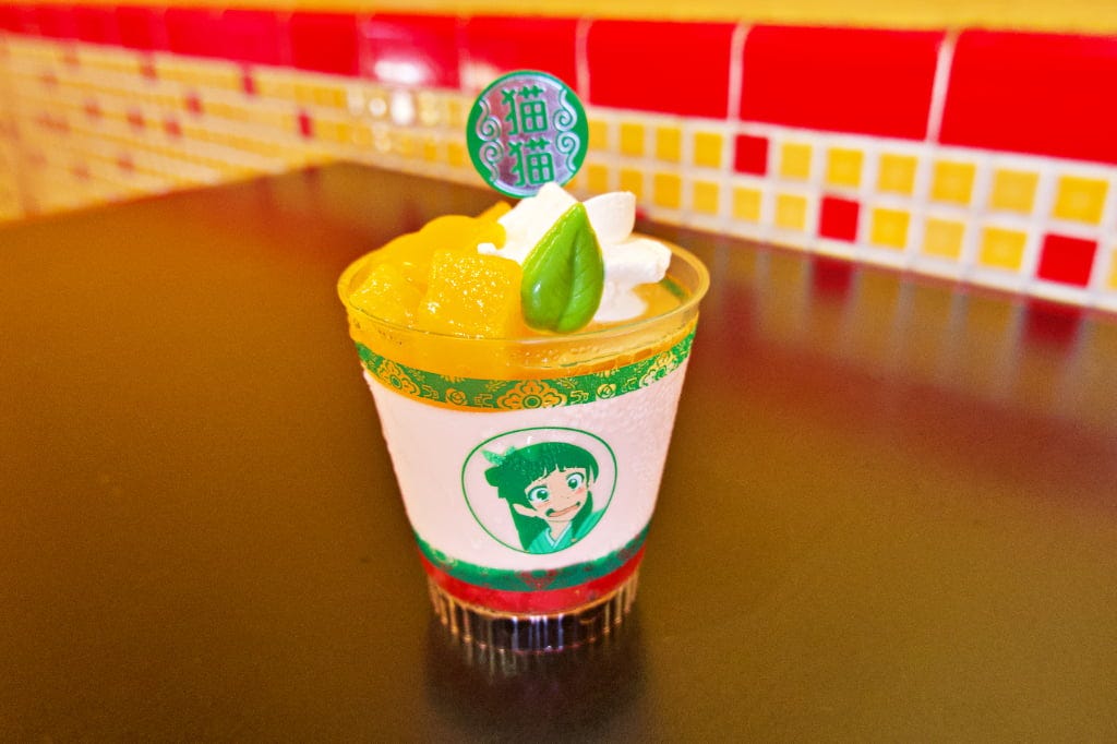 スイーツ好きには「猫猫の苺杏仁豆腐 黄桃添え」もおすすめ。イチゴ風味の杏仁豆腐とベリーソースが層になった、華やかで上品な味わい。猫猫のイラストが描かれたカップは、食べ終わったあとも持ち帰りたくなるかわいさです。
