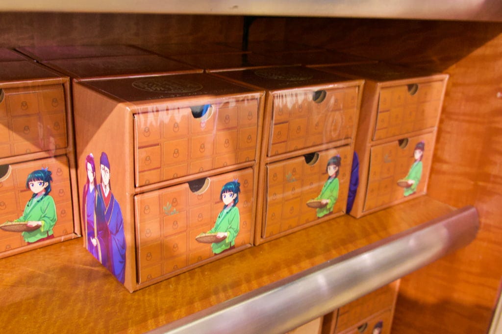 そして、月餅やチョコクランチを薬箱風のパッケージに詰め合わせたアソートスウィーツも登場。引き出しの裏には、猫猫と壬氏が隠れているので、開ける瞬間まで楽しめる仕掛けになっています。