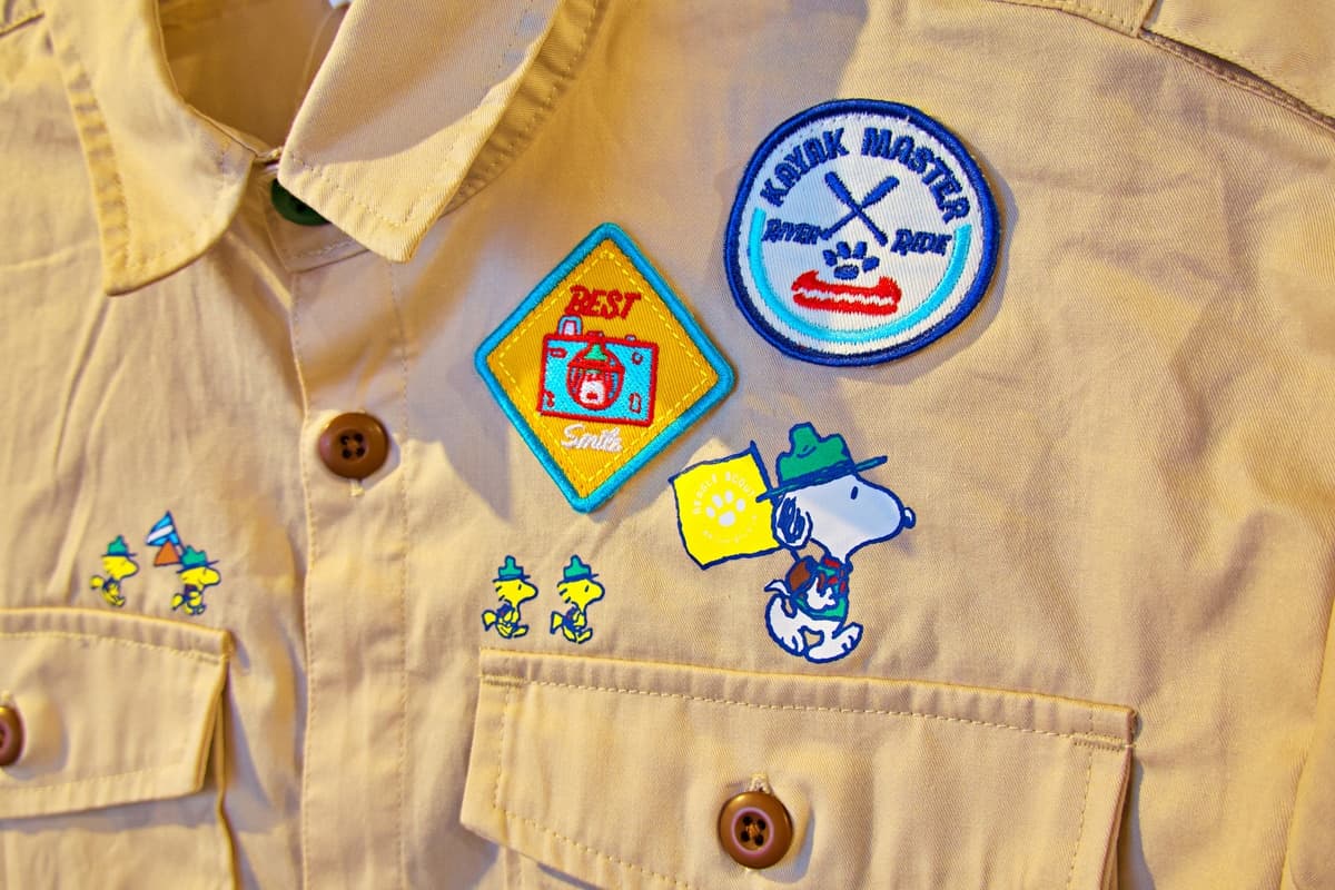 「ビーグル・スカウト」をイメージしたワッペンがポイントのシャツ。「さぁ冒険に出発だ!」と、ウッドストックと仲良く行進するスヌーピーたちがかわいすぎます!