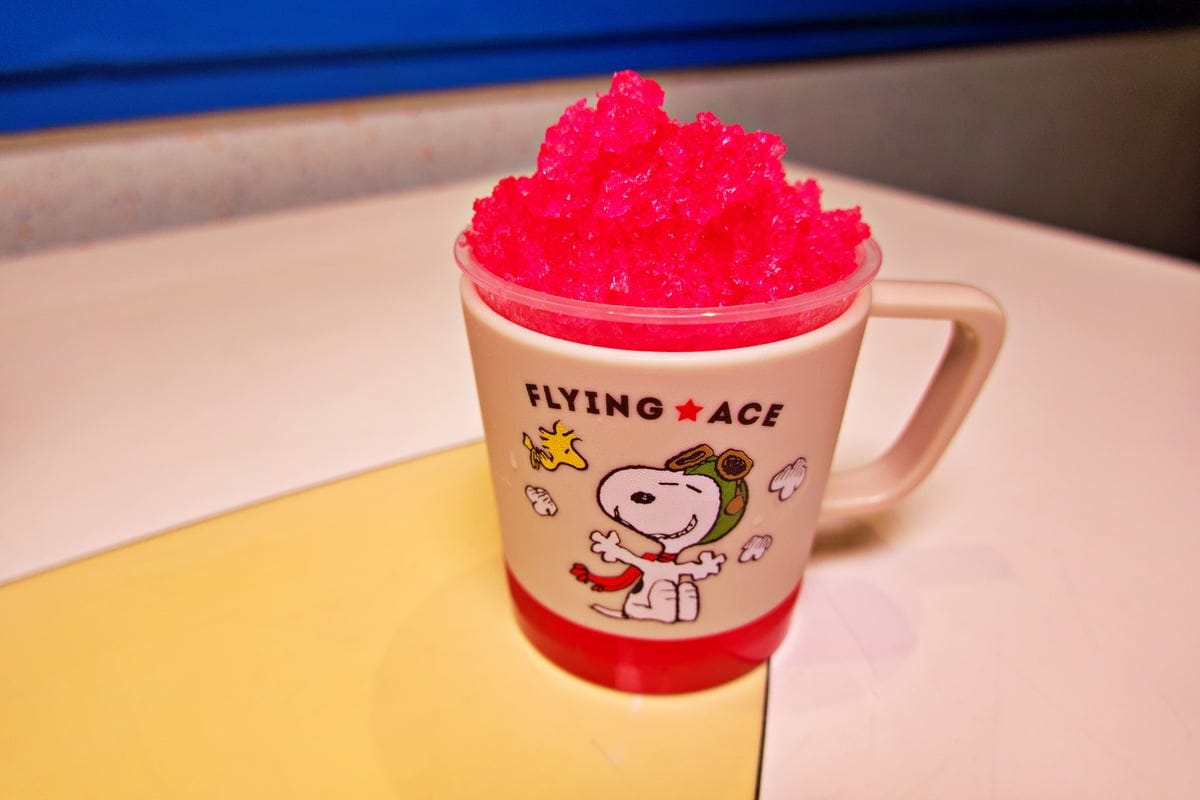 中でも注目は、「イチゴ・フラッペ スヌーピー・マグカップ付き」。「フライング・エース」に扮したスヌーピーがデザインされた「マグカップ」(容量225mL)がセットになっていて、食べ終わった後はマグをお土産に持ち帰れる人気メニューです。