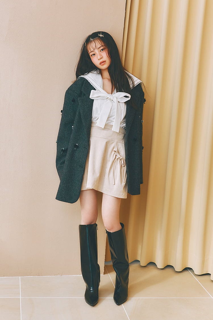 白くてふわっとした質感のスエードレザーミニ。ジャケットとブーツを黒くまとめるとコーデが締まってオトナ可愛い♡