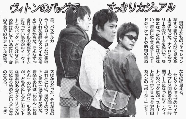 2000年3月25日付男の子たちのファッションがすっきりと大人びて見えるようになった。ナイロンやフリースのパーカを脱いで、身軽になったからだけではない。着古したようなテーラードジャケットや柄物の重ね着、パステルカラーのカーディガンなどを取り入れた新鮮なスタイルが増えてきたからだ。そんなすっきりスタイルの重要アイテムになっているのが「ルイ・ヴィトン」のバッグ。さりげなく斜め掛けにしているだけで、きのうまでのカジュアルが違ったものに見える。