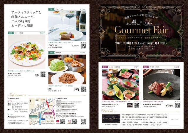 フェア期間中に本展の会場出口に設置する「ヒルトンプラザ×アール・デコ100年展グルメフェア」のチラシを「ヒルトンプラザEAST・WEST」のインフォメーションに持っていくと、館内で利用できる「グルメチケット500円分」がもらえます。