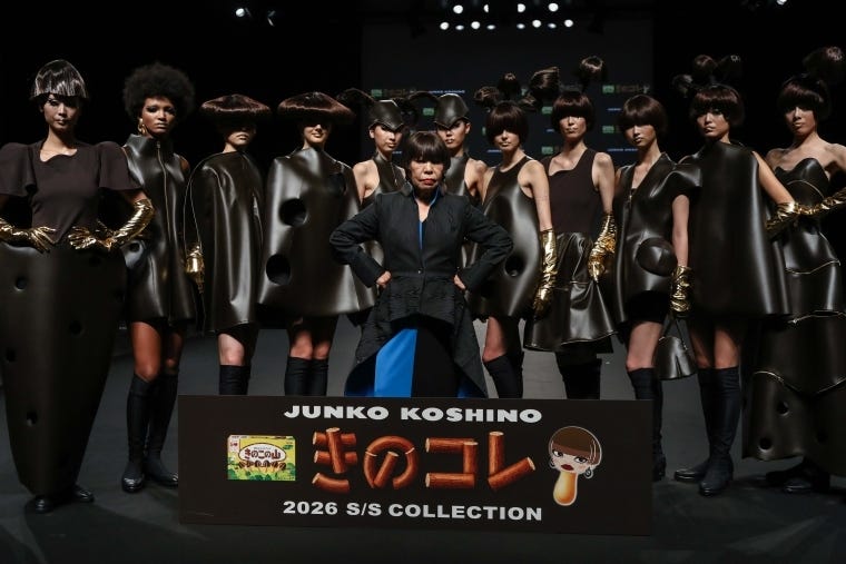 ジュンココシノと明治は10月14日、「きのこの山」50周年を記念し、ファッションショー「ジュンココシノ・きのコレ・2026S/Sコレクション」を開いた。「ジュンココシノ」のブランドショーと、きのこの山にインスパイアされた〝きのコレ〟ファッションショーの二部構成で見せた。