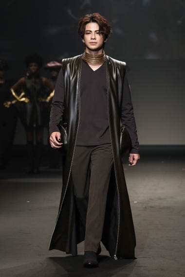 きのこの山のチョコレート部分をフォルムで表現したケープコートやホールターネックのミニドレス、一部が溶けてしまったように丸く穴が空いたミニドレスなど、思わず笑みがこぼれる遊び心にあふれたスタイルが揃う。フィナーレには、きのこの山50周年のアンバサダーを務める俳優の森崎ウィンさんも登場した。